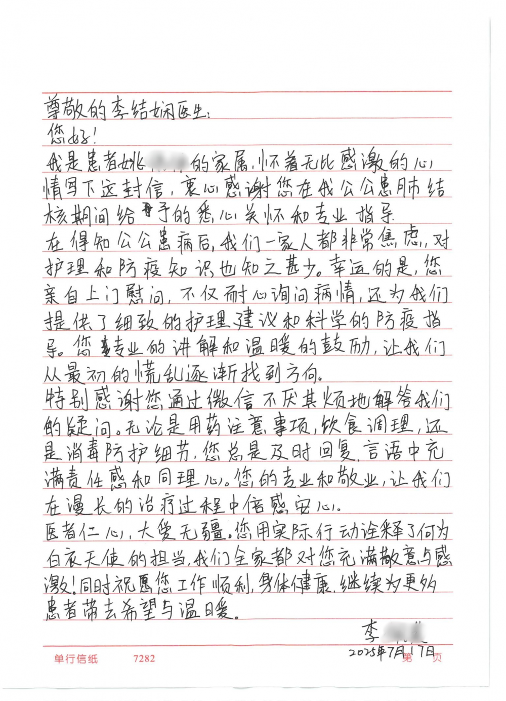 “在最无助的时候,是你们一次次上门,一遍遍讲解,一声声问候,让我们看到了希望,也让我们全家下定决心,一定要治好病!”家属在信中动情地说。这份沉甸甸的谢意,不仅是送给李医生的最高赞誉,更是姚叔一家用行动向社会传递的信念:他们理解并积极配合治疗,拥有战胜结核病的坚定信念和决心。
